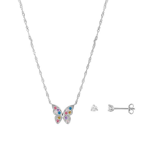 PRIMROSE Sterling Silver Multicolor Nano Stone Butterfly Necklace & Cubic Zirconia Stud Earring